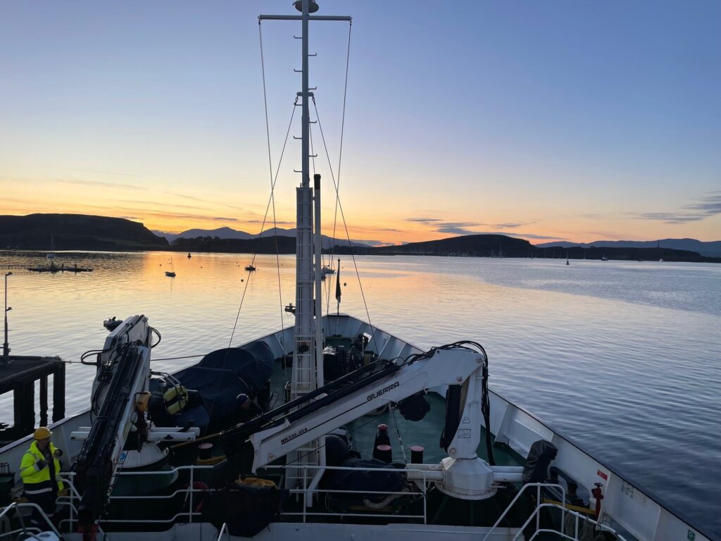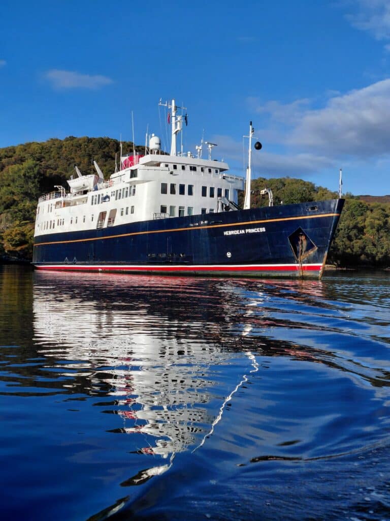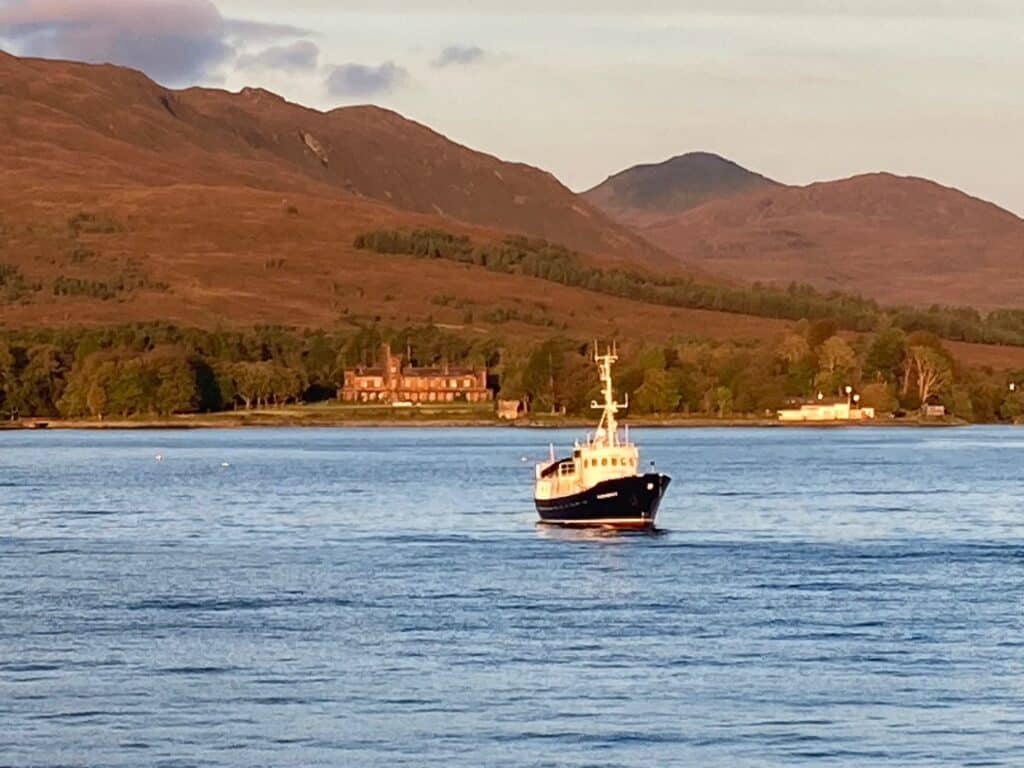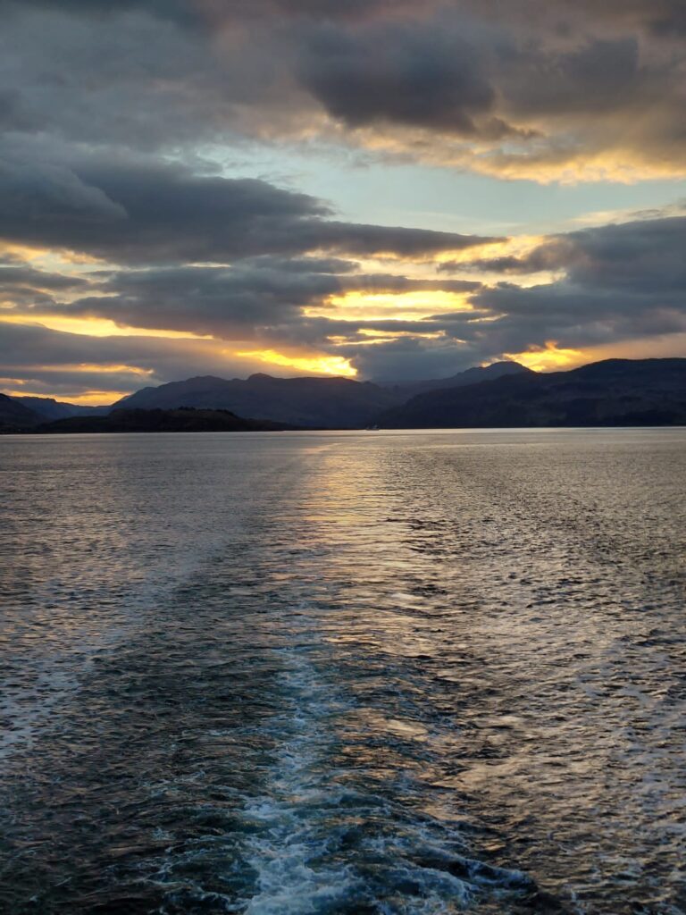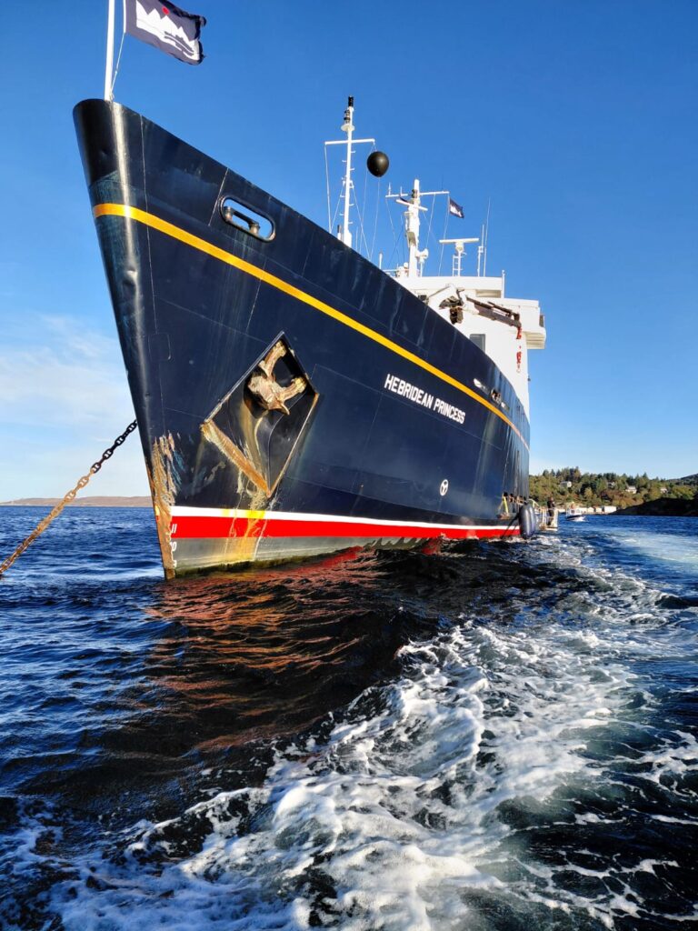A smooth ride up from Glasgow for those guests who travelled on the Hebridean Island Cruises coach – glorious autumn colours along Loch Lomond, stunning views from our stop at Inverary, and evening sunshine as we arrived in Oban to board the Princess. A very warm welcome from Captain James and all aboard, and the chance to reunite with old friends and make new acquaintances as we set sail into the sunset towards our peaceful overnight anchorage.
