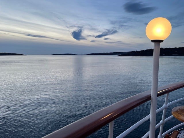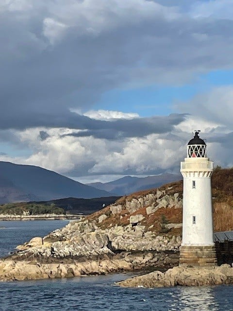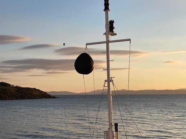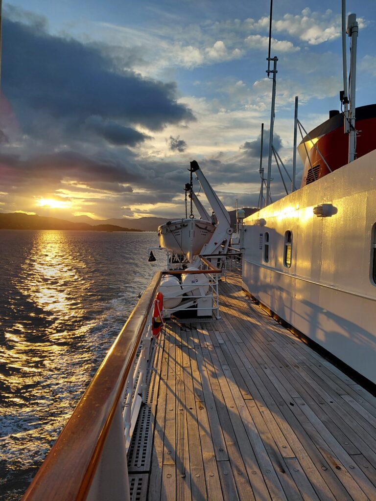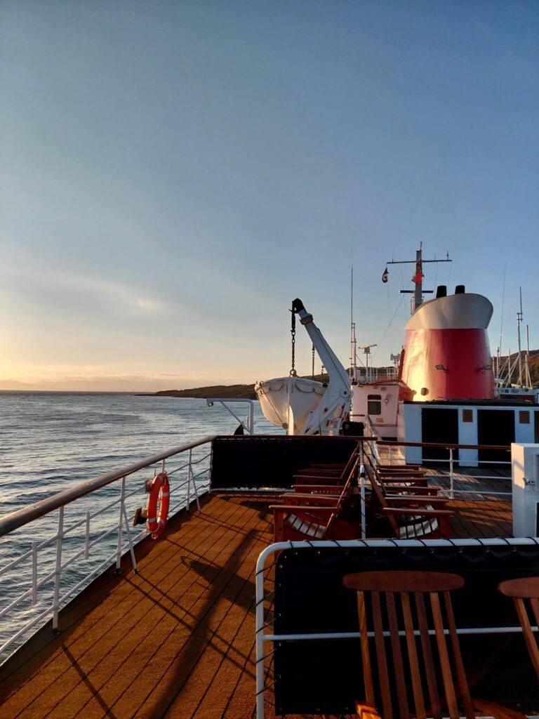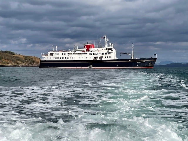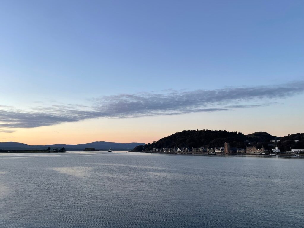A smooth ride up from Glasgow for those guests who travelled on the Hebridean Island Cruises coach – glorious autumn colours along Loch Lomond, stunning views from our stop at Inverary, and evening sunshine as we arrived in Oban to board the Princess. A very warm welcome from Captain James and all aboard, and the chance to reunite with old friends and make new acquaintances as we set sail into the sunset towards our peaceful overnight anchorage.