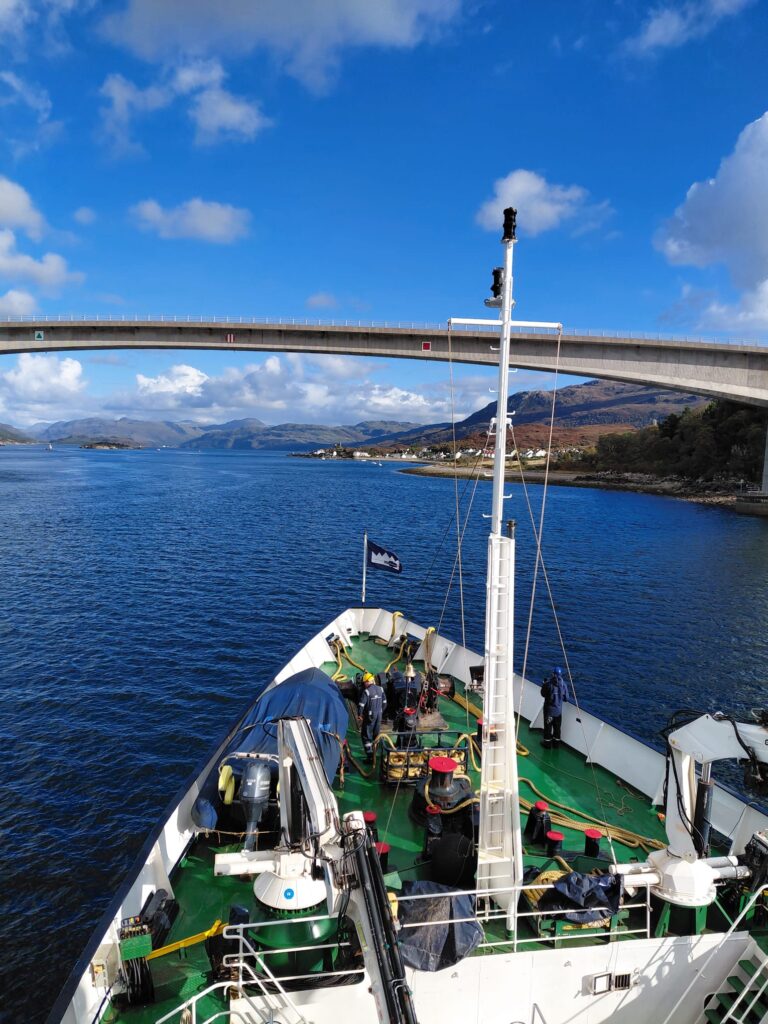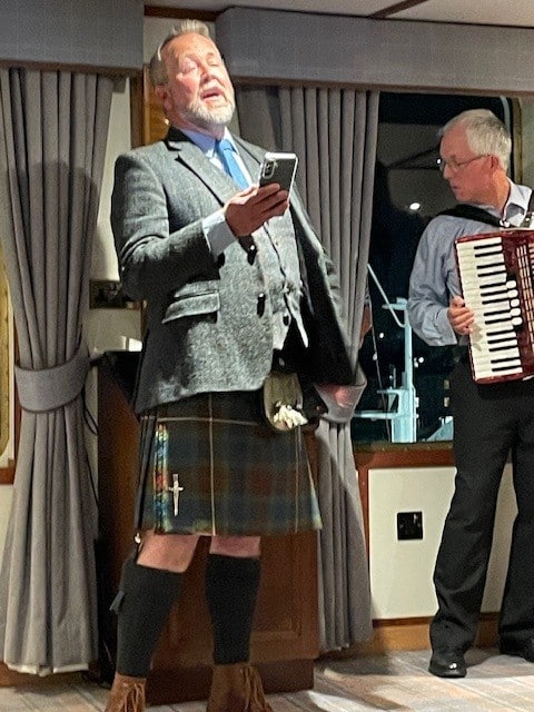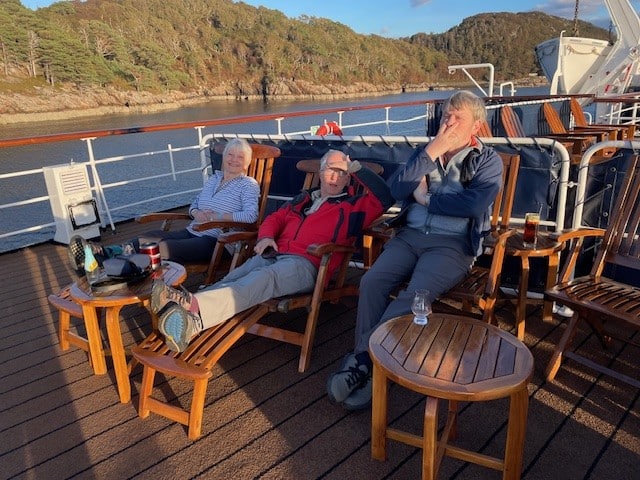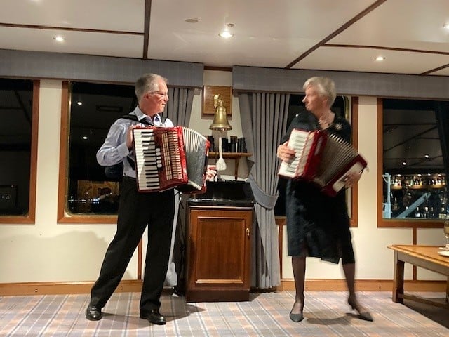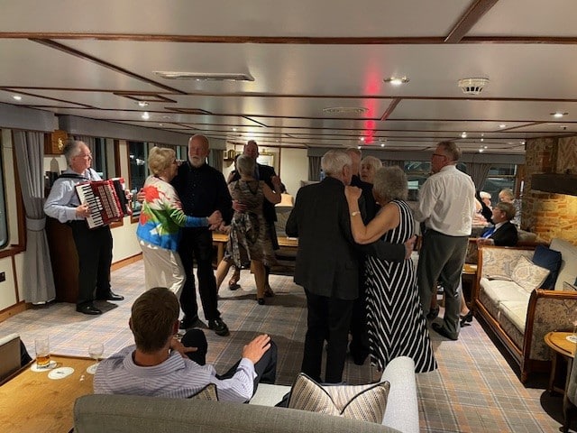 A restful afternoon at sea for everyone as we sailed south alongside Skye and under the Skye Bridge for our evening alongside at Kyle of Lochalsh. Dinner was followed by music, dancing and much laughter courtesy of the talents of our guide John and his accordion, with ‘special guest’ performances by others onboard.